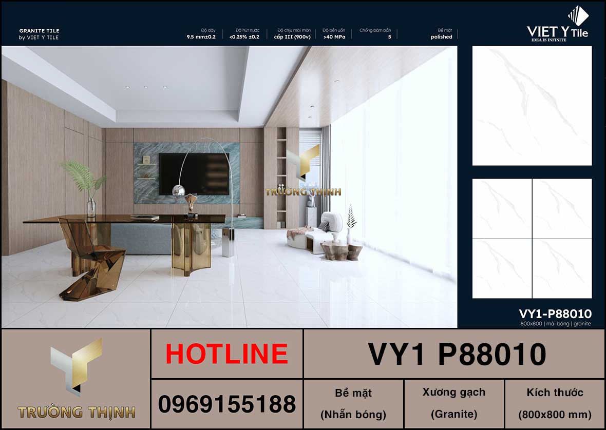 Để xem mẫu gạch Việt Ý VY1 P88010 hay mua được sản phẩm gạch Việt Ý VY1 P88010 chính hãng với giá tốt nhất, quý khách vui lòng liên hệ với các đại lý phân phối Gạch Việt Ý trên toàn quốc hoặc liên hệ ngay với Trường Thịnh để được tư vấn và nhận báo giá tốt nhất cho sản phẩm Gạch Granite Vân Mây 800x800 Việt Ý VY1 P88010!