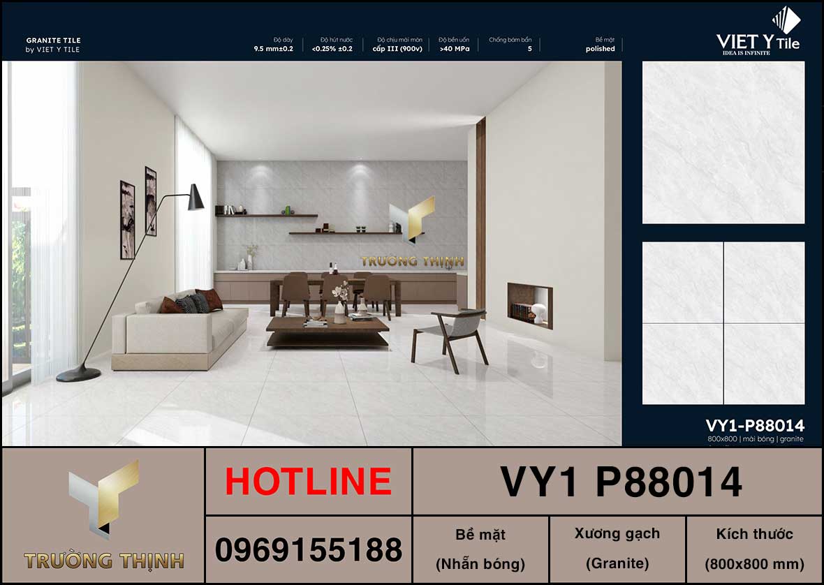Để xem mẫu gạch Việt Ý VY1 P88014 hay mua được sản phẩm gạch Việt Ý VY1 P88014 chính hãng với giá tốt nhất, quý khách vui lòng liên hệ với các đại lý phân phối Gạch Việt Ý trên toàn quốc hoặc liên hệ ngay với Trường Thịnh để được tư vấn và nhận báo giá tốt nhất cho sản phẩm Gạch Lát Sàn Granite 800x800 Việt Ý VY1 P88014!